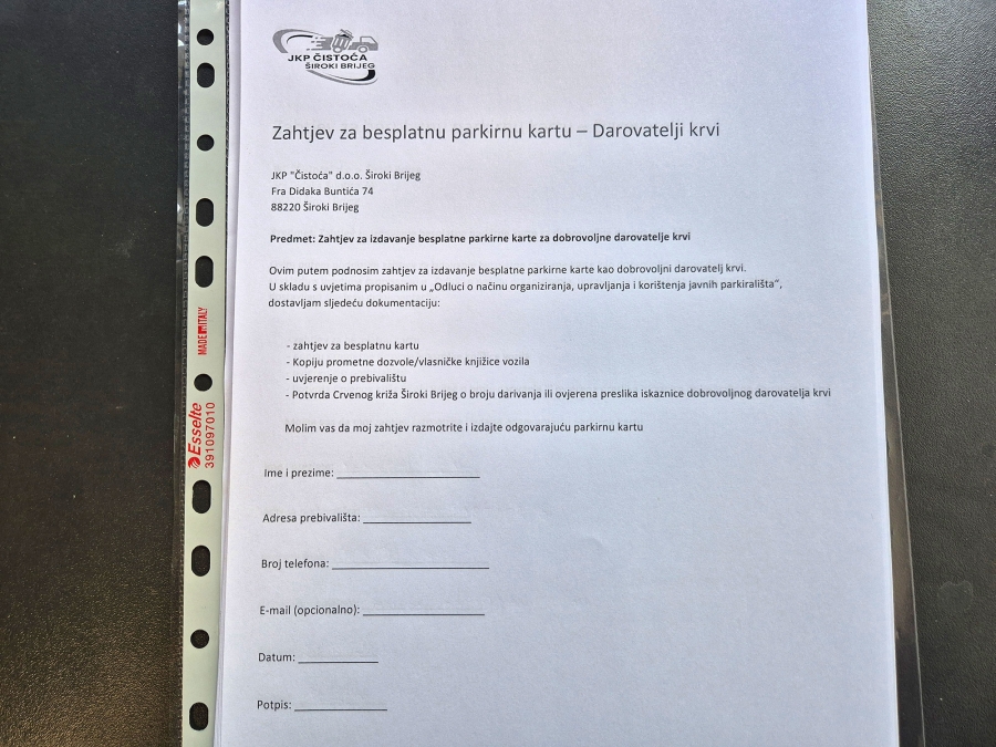 Podnošenje zahtjeva za ostvarenje prava na besplatan parking za dobrovoljne darivatelje krvi u Širokom Brijegu započelo je u ponedjeljak, 27. travnja, u prostorijama Javnog komunalnog poduzeća Čistoća (dvorana Pecara)